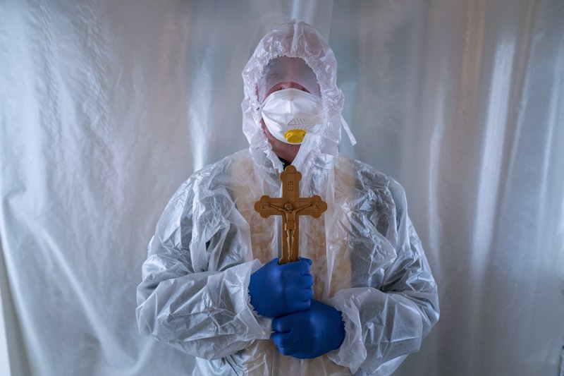 Father Stephan, a Ukrainian Greek Catholic Church priest, wearing a special suit to protect himself against coronavirus, stands, after visiting patients with COVID-19 at an intensive care unit of the emergency hospital in Lviv, Western Ukraine, Saturday, Jan. 9, 2021.