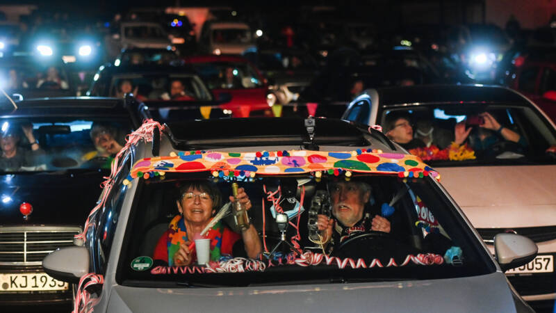 Revelers sit inside their car during a drive-in carnival session in Monheim, Germany, a mid the coronavirus Covid-19 pandemic.